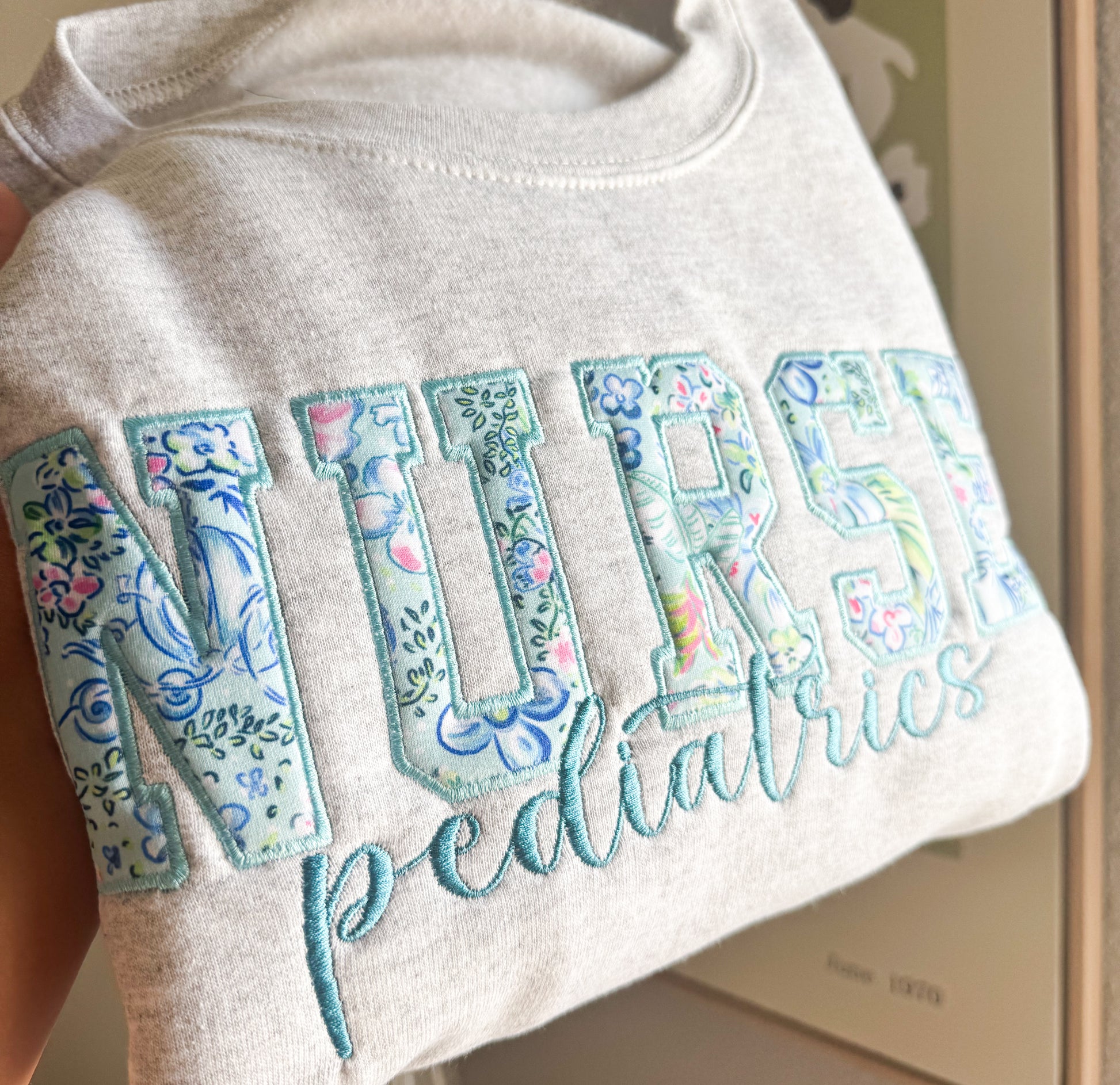 Show off your passion for nursing in style! This cozy sweatshirt features a bold 10x5-inch appliqué design across the center, with “NURSE” in a vibrant, floral fabric and “pediatrics” beautifully embroidered beneath. Each piece is uniquely handmade, so no two are exactly alike.